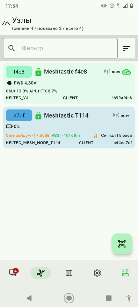А вот приложение с V4 в то же время в том же месте. И картина здесь показана типичная, которую я много раз наблюдал за время этого похода. Там, где Pro-micro показывает средний сигнал , V4 показывает плохой. Там, где Pro-micro показывает плохой, V4 вообще не ловит.