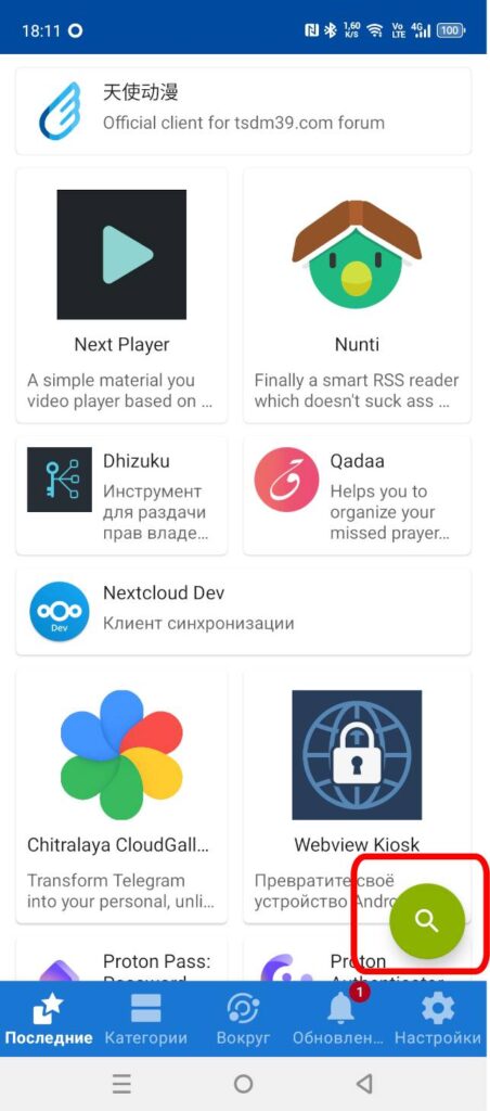 Запускаем F-Droid, нажимаем значок лупы — поиск приложений.