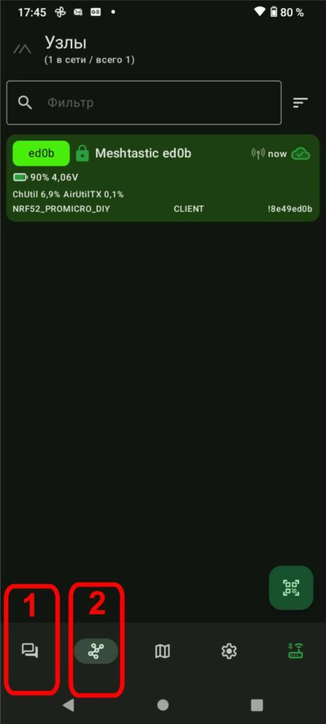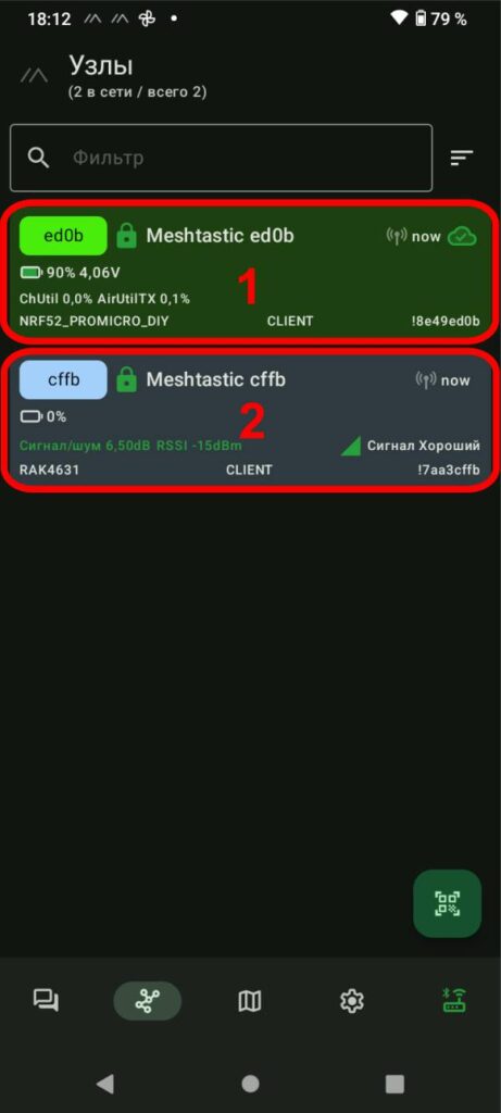 На этом скриншоте на вкладке «Узлы» отображается наше устройство (1) и другое устройство на этом канале (2).