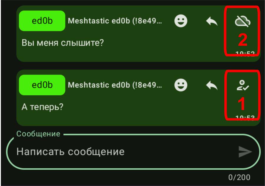 Если отправка была успешной, через некоторое время справа от сообщения появляется значок с галочкой (1). Если сообщение отправить не удалось — появляется значок с перечеркнутым облаком (2). В этом случае рекомендуется сделать еще одну попытку.