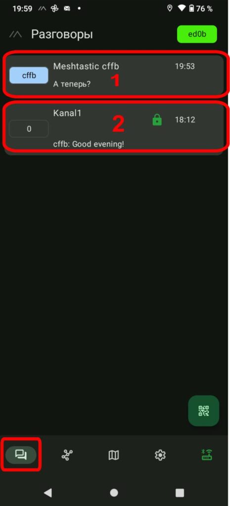 В приложении для всех этих действий служат две вкладки: «Разговоры» (1) и «Узлы» (2).