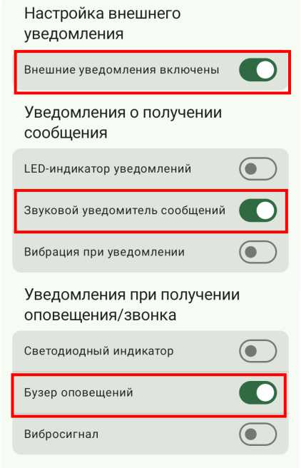 Здесь включаем 3 настройки: «Внешние уведомления включены», «Звуковой уведомитель сообщений» и «Бузер оповещений».