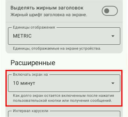 Самая полезная настройка для устройства с дисплеем — это то, сколько времени будет включен дисплей при отсутствии активности. По умолчанию 10 минут, но, как мне кажется, это время полезно будет уменьшить. Чтобы это сделать, в приложении Meshtastic в настройках заходим в раздел «Дисплей» и находим там «Включать экран на». После установки нужного значения, пролистываем вниз и нажимаем «Сохранить».