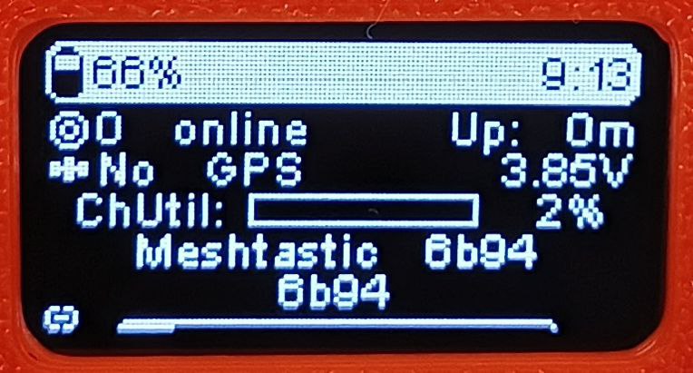 После этого появится начальный экран, на котором содержится общая информация о состоянии устройства. Например, в данном случае это (если смотреть снизу вверх) краткое название узла «6b94», полное название «Meshtastic 6b94», использование канала 2%, GPS отсутствует или не настроен, напряжение батареи 3,85 В, других нод пока не обнаружено (0), после перезагрузки прошло 0 минут, заряд батареи 66%, время 9:13. Скорее всего, время у вас он показывает неверно. С настройки правильного времени и начнем.
